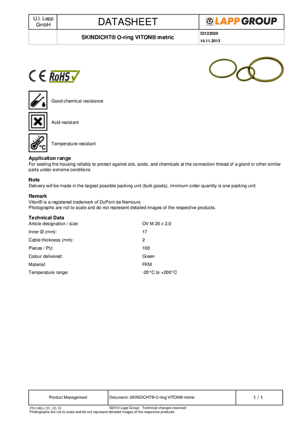 LAPP 52122020 SKINDICHT O-RING M20/17X2 VITON M20 kauczuk nitrylo-butadienowy zielony 100 szt.