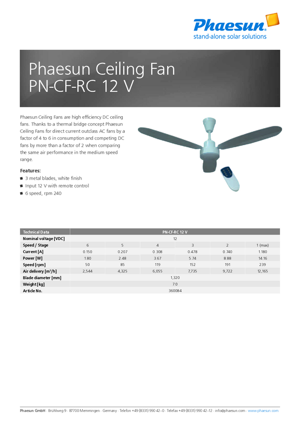 Phaesun CF-RC 12V Wentylator sufitowy (Ø) 132 cm biały pilot zdalnego sterowania