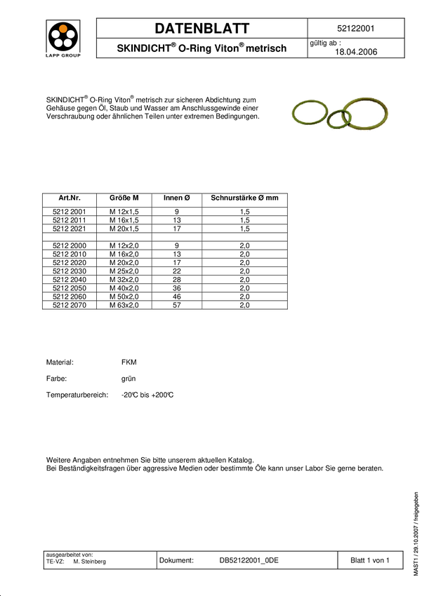 LAPP 52122000 SKINDICHT O-RING M12/9X2 VITON M12 kauczuk nitrylo-butadienowy zielony 100 szt.