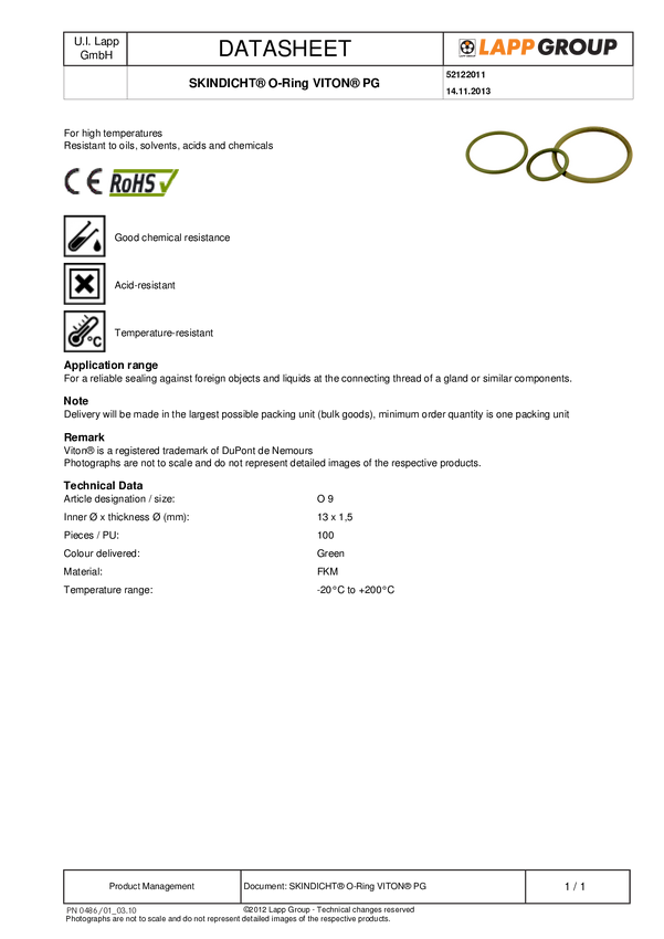 LAPP 52122011 SKINDICHT O-RING M16/PG 9/13X1,5 VITON, M16, 100 szt.