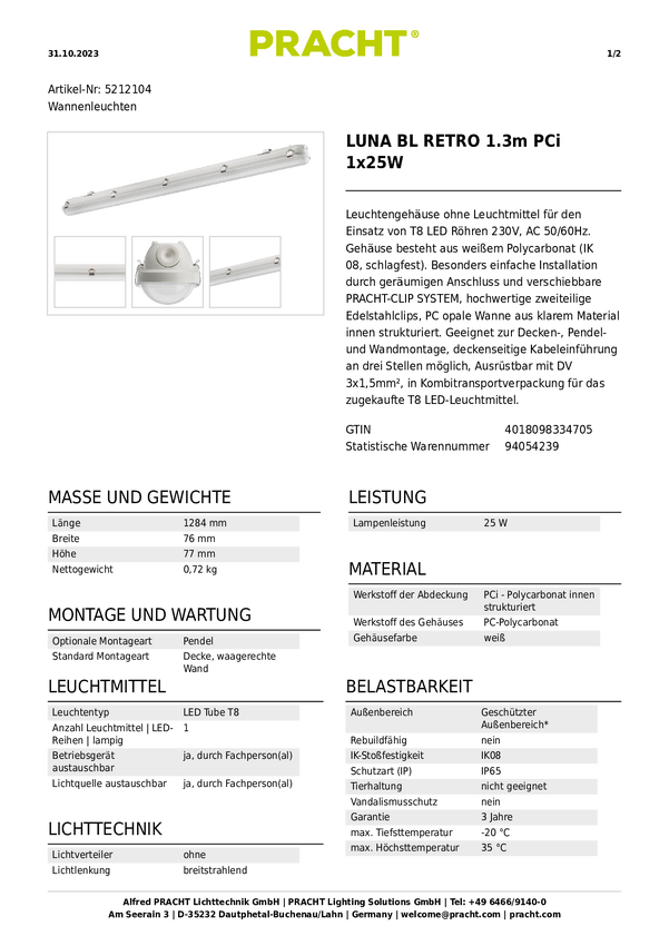 Lampa LED do wilgotnych pomieszczeń Pracht 5212304 5212304, 25 W