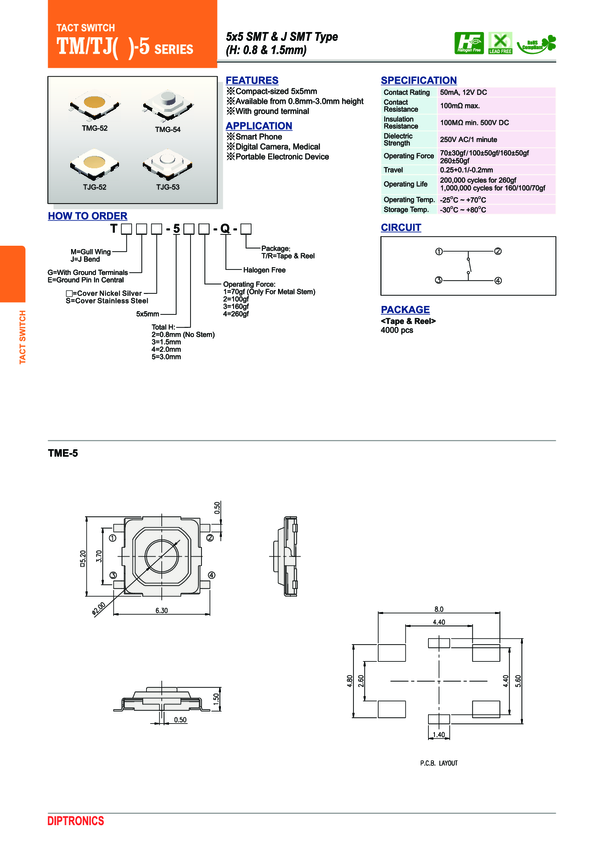 Switch Tactile Round Button Solder 0.05A 12V 200000Cycles 2.54N SMD T/R