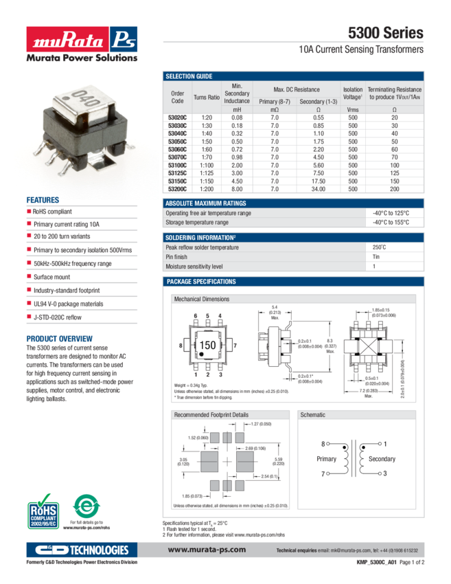 Current Transformer 1:200 500Vrms 0.007Ohm Prim. DCR 34Ohm Sec. DCR 10000mA Surface Mount