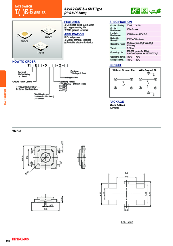 Switch Tactile Round Button Solder 0.05A 12V 200000Cycles 2.54N SMD T/R