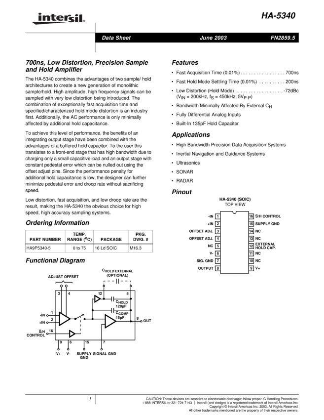 700ns, Low Distortion, Precision Sample and Hold Amplifier