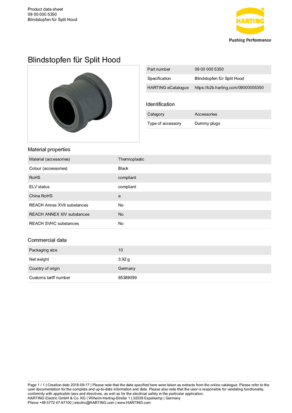 Tuleja przepustu kablowego Harting 09 00 000 5353, 1 szt.