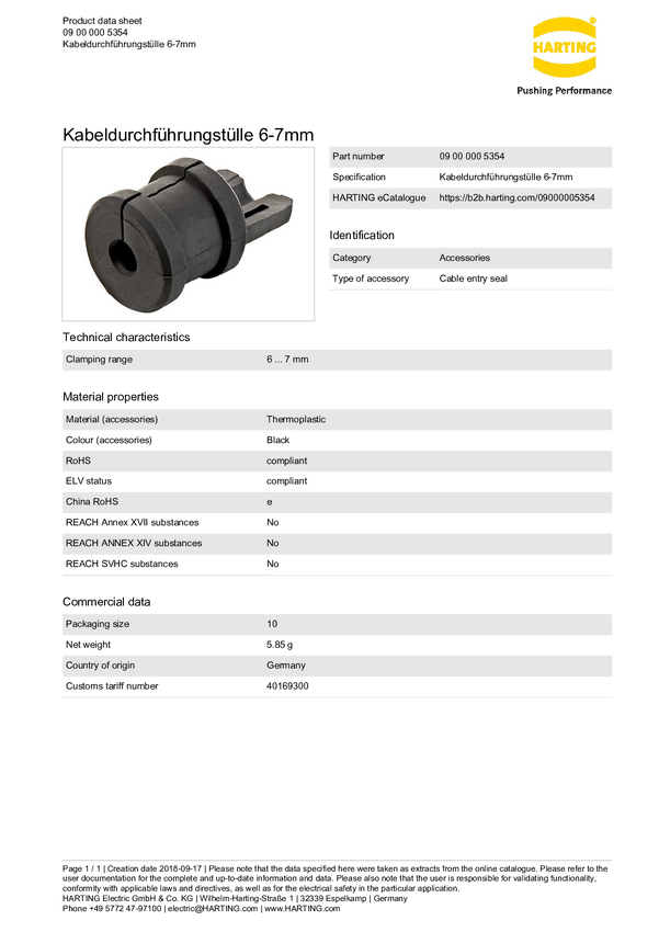 Tuleja przepustu kablowego Harting 09 00 000 5352, 1 szt.