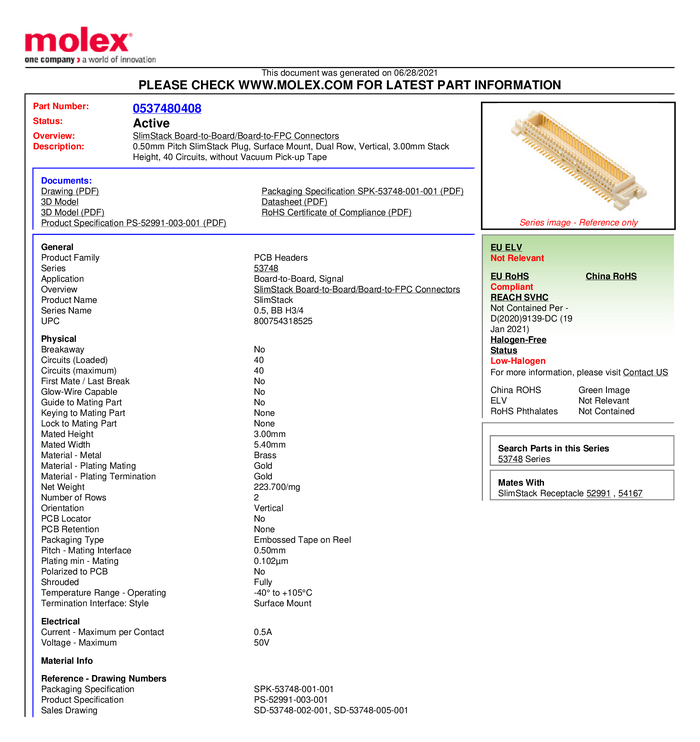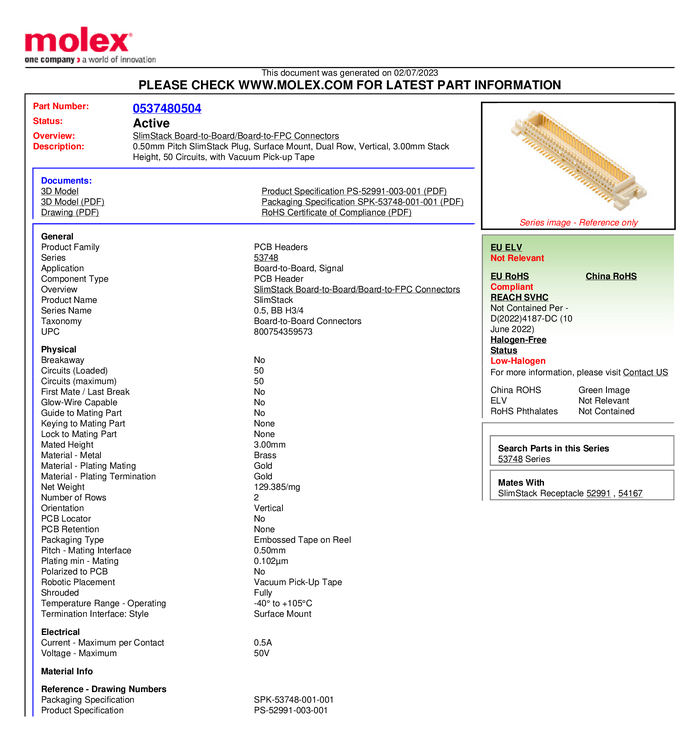 Molex Złącze taśmowe Ilość pinów 50 Wymiary siatki: 0.50 mm 537480504 1 szt. taśma na dużej rolce