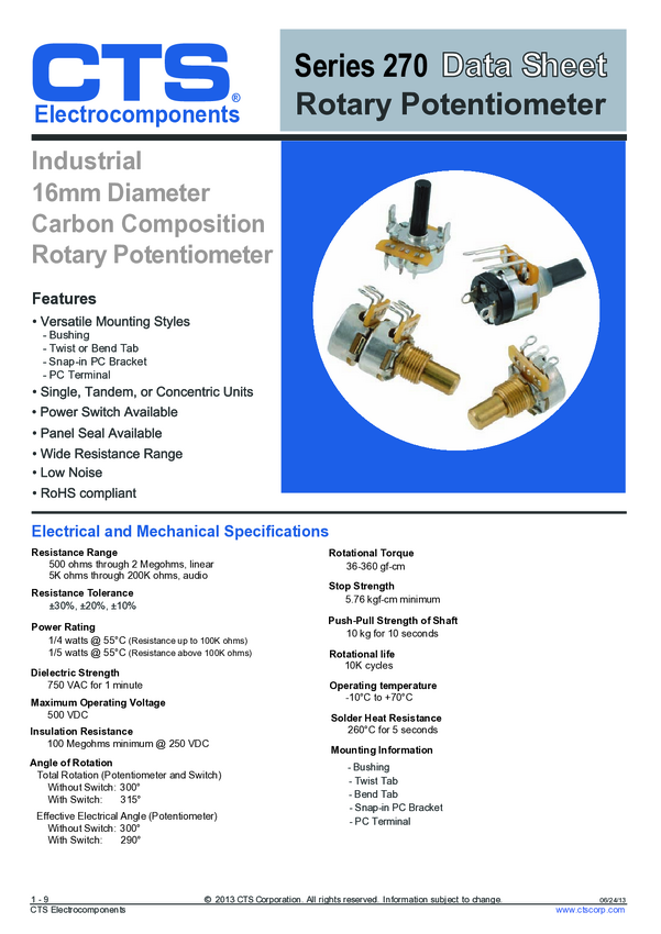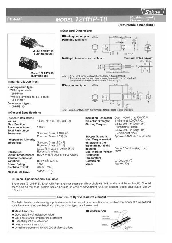 Potencjometr hybrid; servo; lin=0,4%; 1W; lug terminals 10 obrotowy; średnica=14mm; ośka=3mm Produkcja firmy SAKAE; na zamówienie wersje podobne kołnierz servo średnica 9,5mm ( 9,53mm ) / 12,7 mm