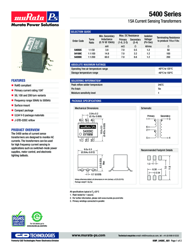Current Transformer 1:1:50 1200Vrms 0.007Ohm Prim. DCR 0.5Ohm Sec. DCR 15000mA Surface Mount