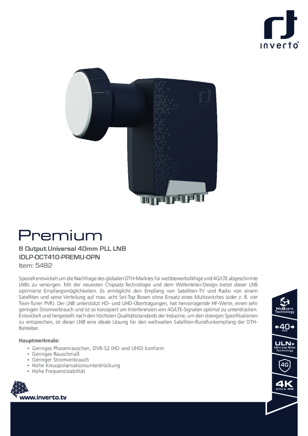 Inverto Inverto IDLP-OCT410-PREMU-OPN Octo-LNB Octo-LNB Ilość uczestników: 8 Rozmiar zasilenia: 40 mm czarny