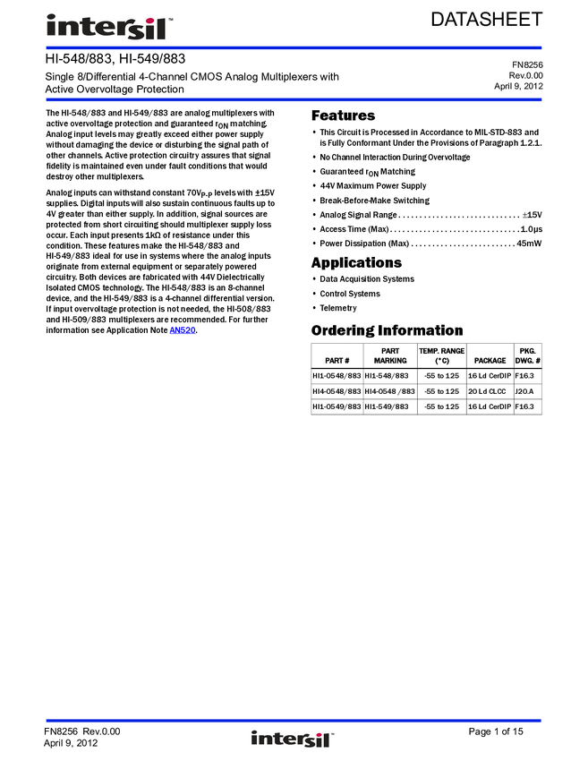 Single 8/Differential 4-Channel CMOS Analog Multiplexers with Active Overvoltage Protection