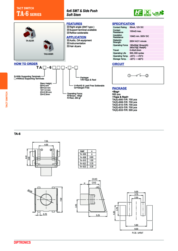 Switch Tactile N.O. SPST Round Plunger PC Pins 0.05A 12VDC 500000Cycle 2.549N SMD T/R