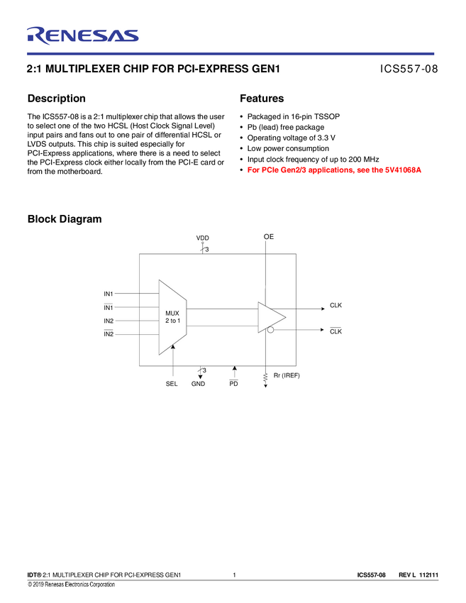 2:1 Multiplexer Chip For PCI-Express GEN1