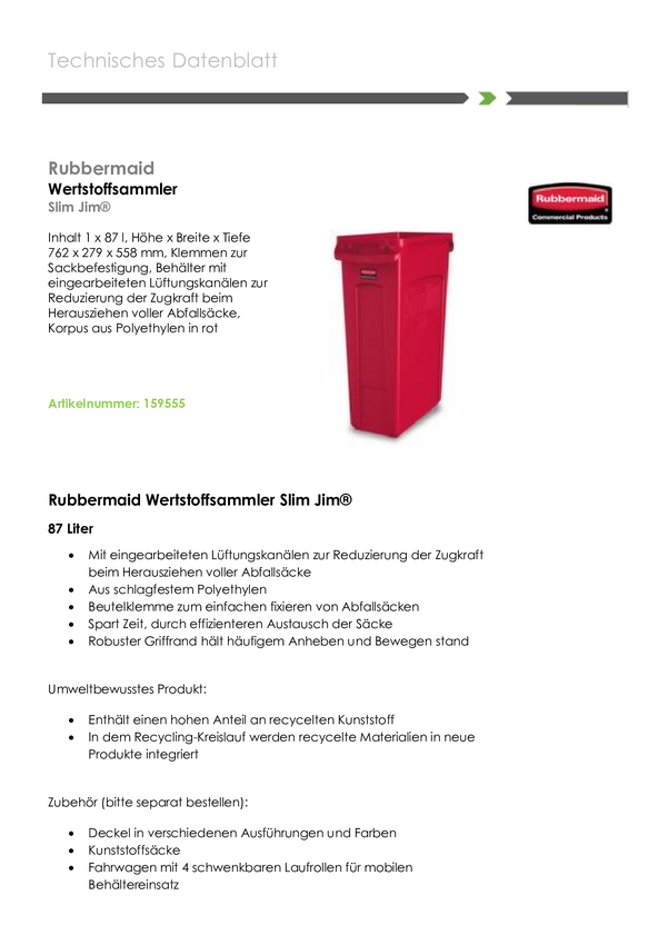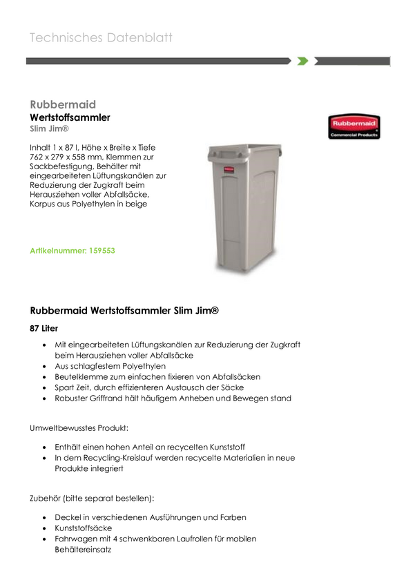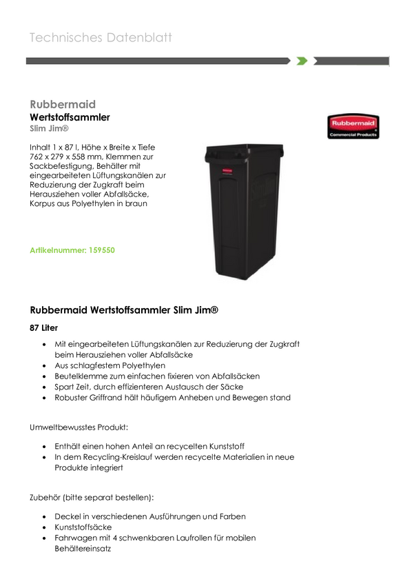 Rubbermaid 0086876186390 Pojemnik do recyklingu 87 l (S x W x G) 279 x 762 x 558 mm zielony N/A 1 szt.