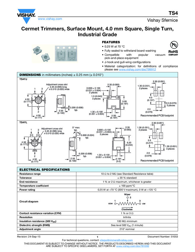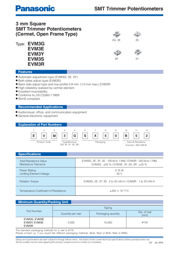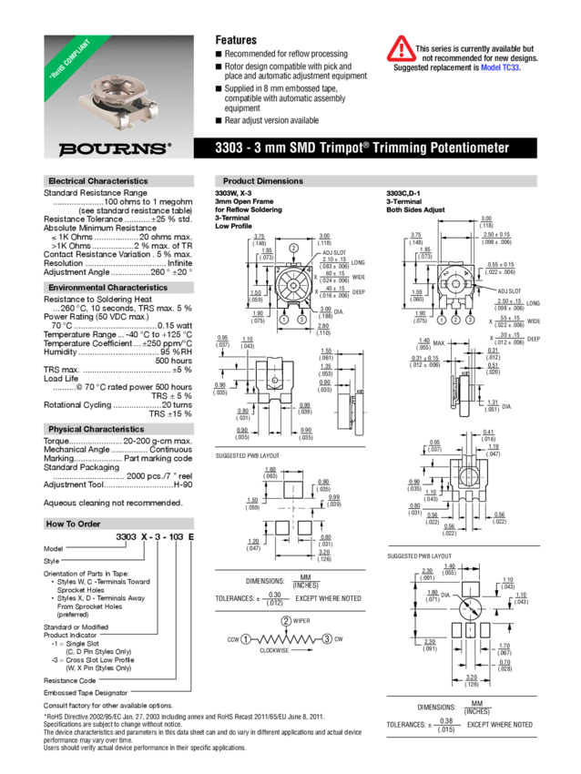 Res Trimmer 500 Ohm 25% 3/20W 1(Elec)/1(Mech)Turn (3 X 3.75 X 1.55mm) Foot Print SMD Embossed T/R
