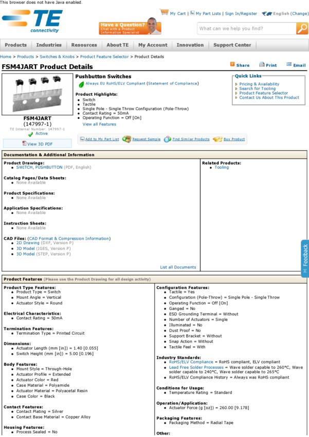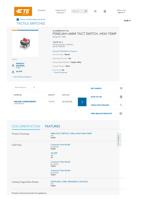 Switch Tactile SPST Gull Wing 0.0015A 5V 200000Cycles 2.55N SMD T/R