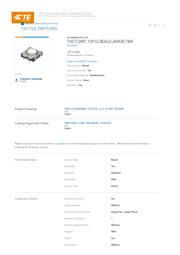 Switch Tactile N.O. SPST Round Button Gull Wing 0.05A 12VDC 2.55N SMD Tube/Bulk