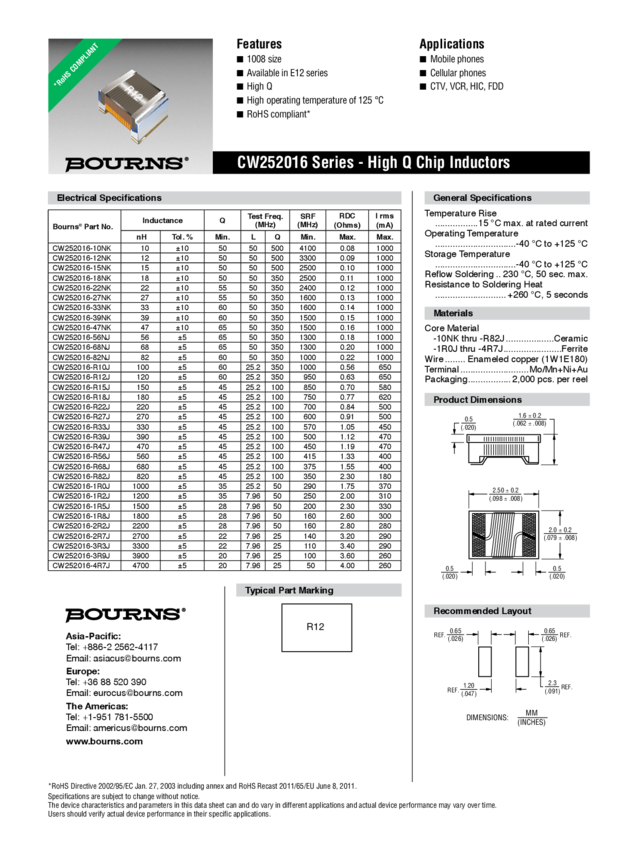 Ind Chip Wirewound 27nH 5% 100MHz 55Q-Factor Ceramic 600mA 1008 T/R