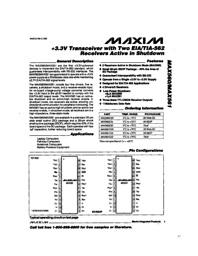 MAX561 3.3V Transceiver with Two EIA/TIA-562 Receivers Active in Shutdown