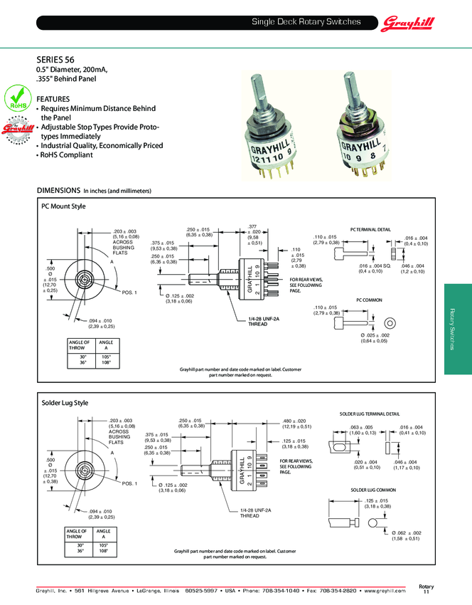 Switch Rotary SP Flatted Shaft Solder Lug 0.2A 115VAC 30VDC
