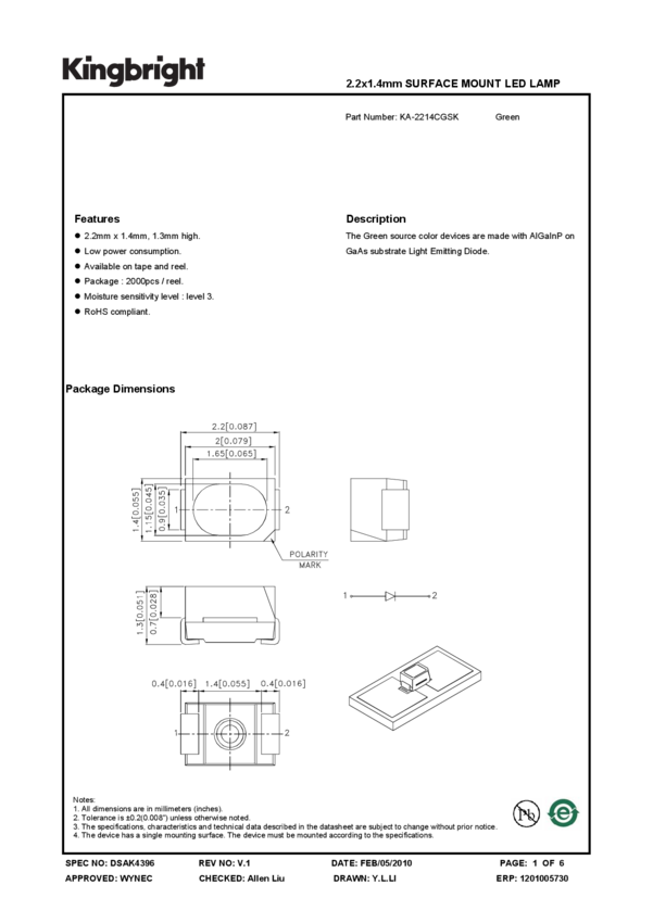 Dioda LED, SMD 0402, (Yellow Green) 574 nm, 39 mCd /20mA, water clear, 120 stopni