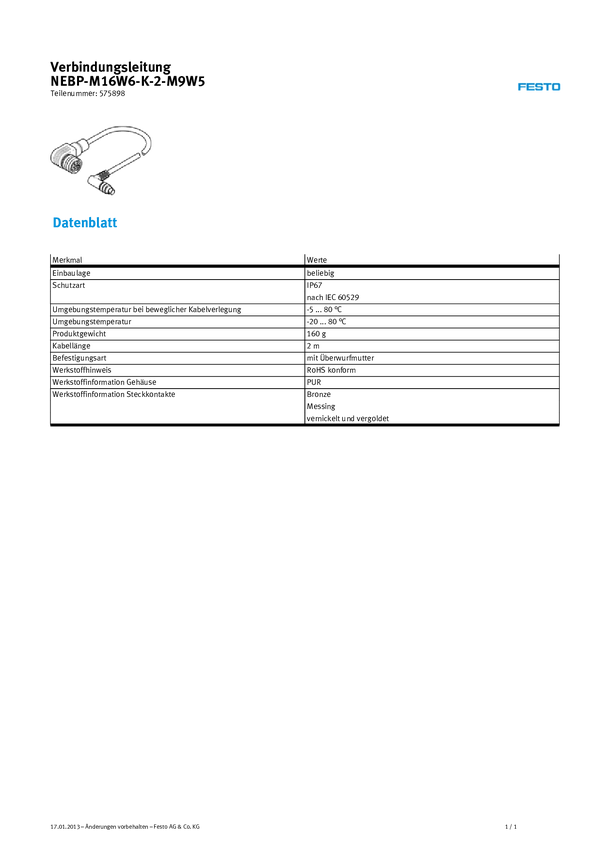 FESTO 575898 Kabel połączeniowy czujnika/aktuatora M16, M9 2.00 m Ilość pinów: 6 1 szt.