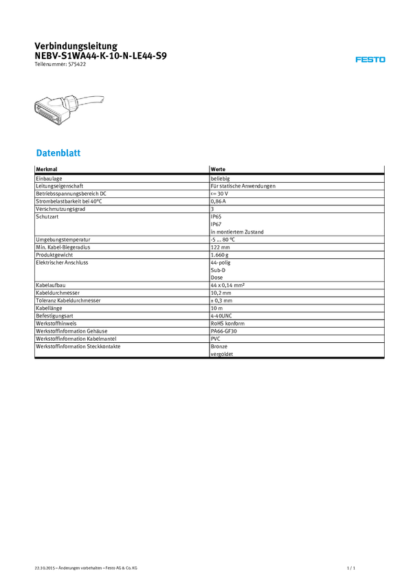 FESTO 575422 Kabel połączeniowy czujnika/aktuatora 10.00 m Ilość pinów: 44 1 szt.