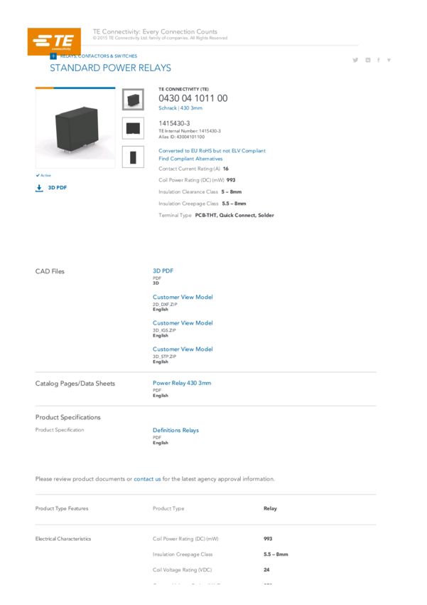 Electromechanical Relay DPDT 16A 24VDC 580Ohm Through Hole
