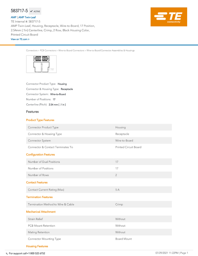 TE Connectivity 583717-5 TE AMP Misc One Piece Card Edge Connectors, 1 szt.