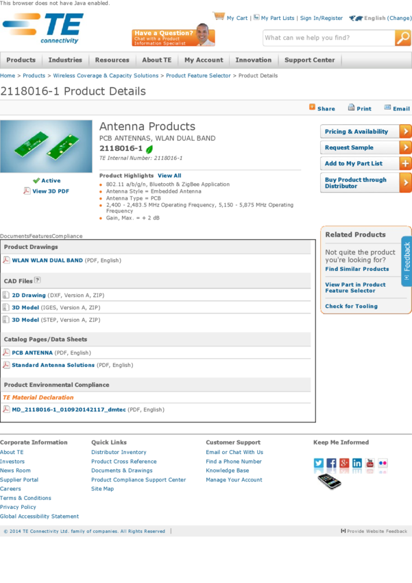 Antenna Bluetooth 802.11a/b/g/n 2dB Gain 2483.5MHz/5875MHz