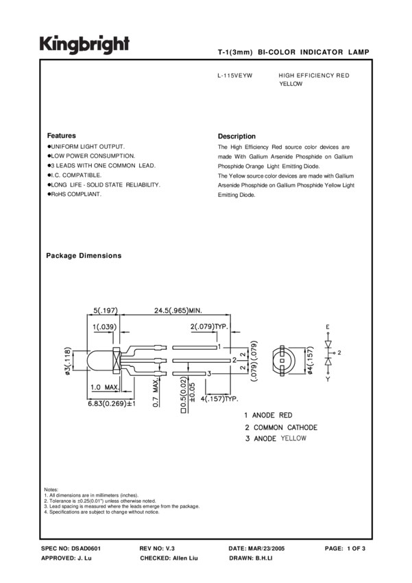 LED Bi-Color Red/Yellow 625/588nm Standard LED 3-Pin T-1 Box