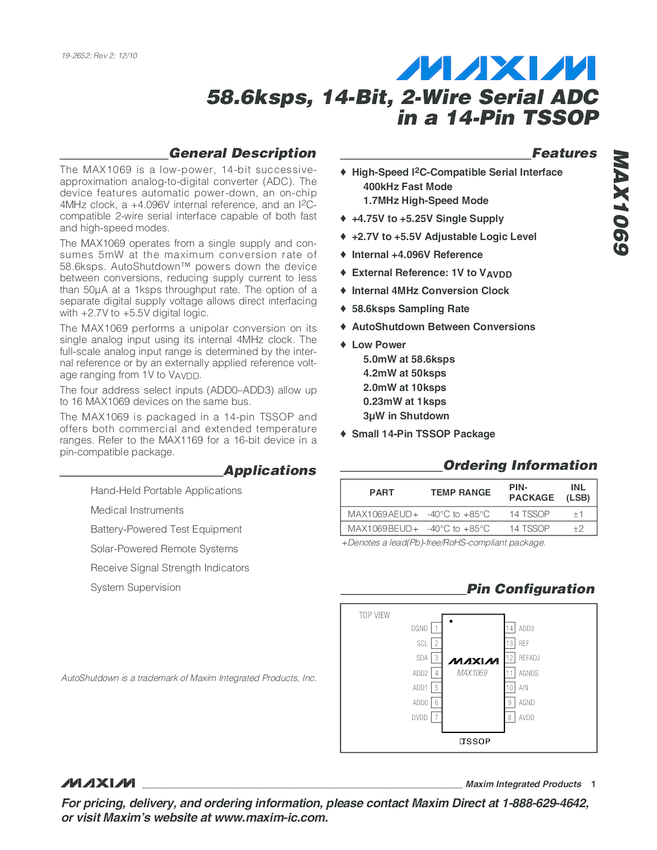 MAX1069 14-bit 58ksps, 2-Wire ADC in a 14-Pin TSSOP
