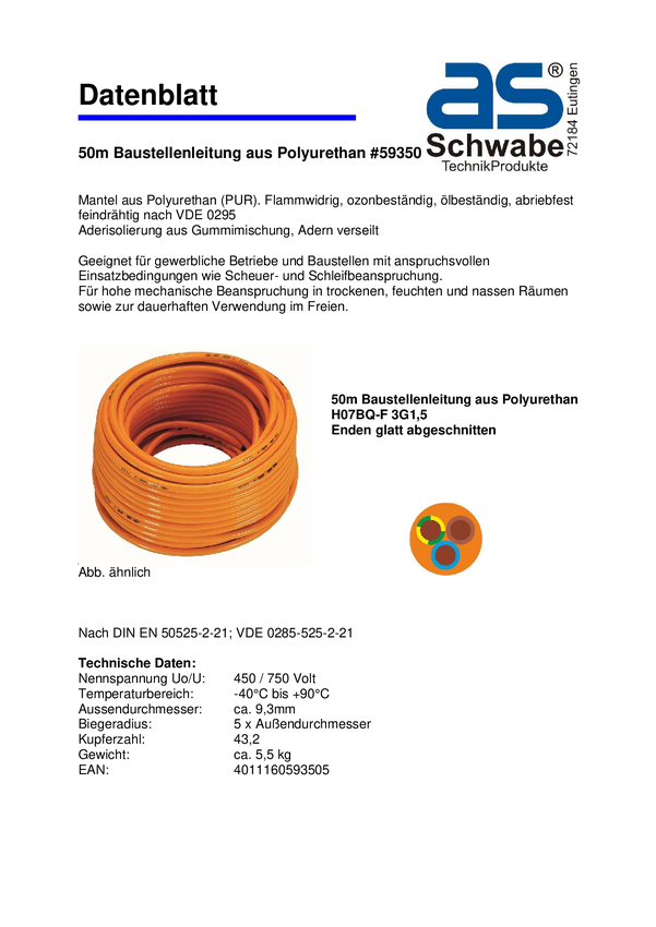 Kabel instalacyjny AS Schwabe 59350, 3 x 1.5 mm², 50 m, pomarańczowy