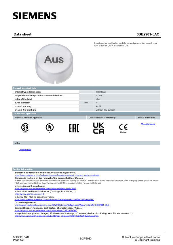 Pokrywka Siemens 3SB2901-5AC 10 szt.