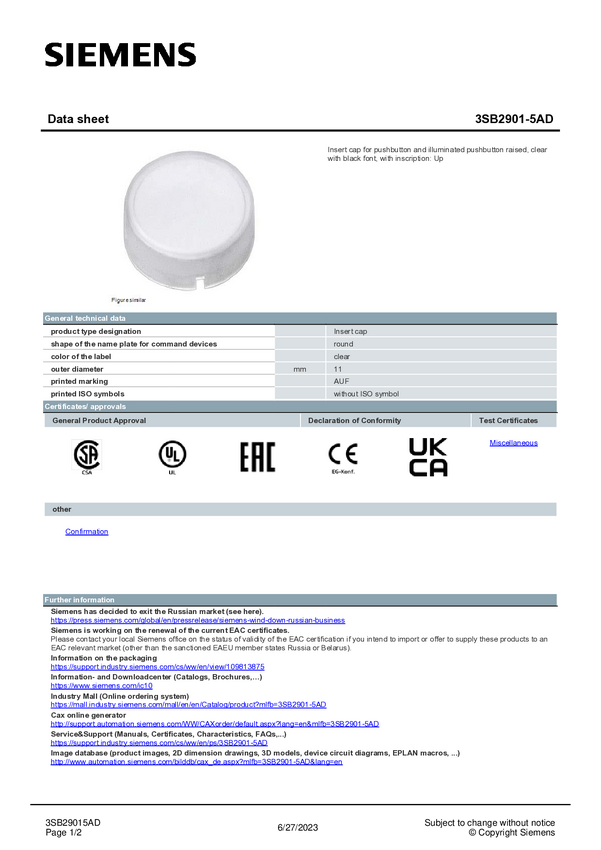 Pokrywka Siemens 3SB2901-5AD 10 szt.