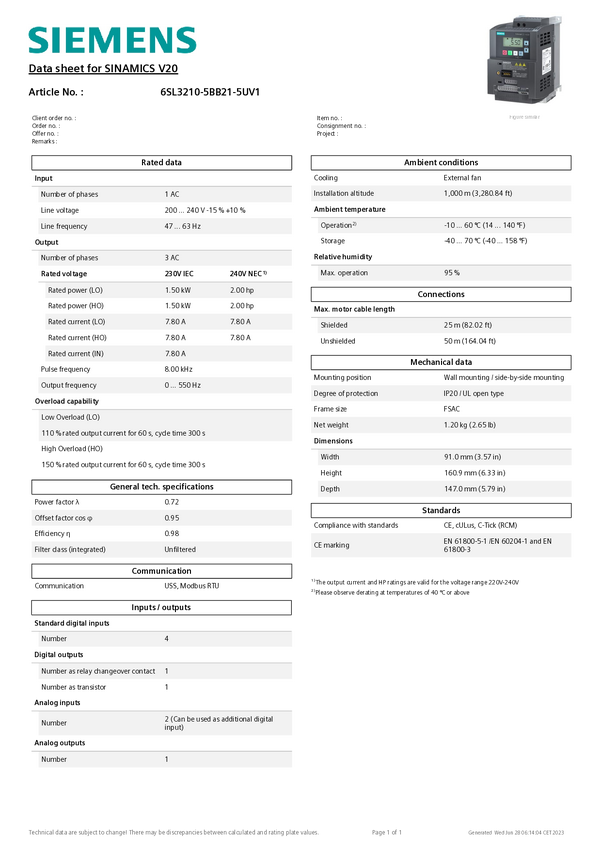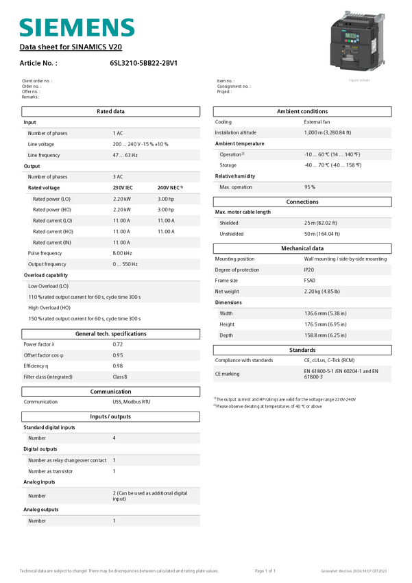 Przemiennik częstotliwości Siemens 6SL3210-5BB23-0UV1
