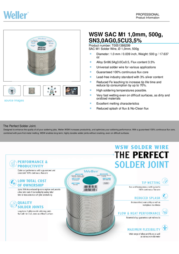Cyna lutownicza bezołowiowa Weller WSW SAC M1 szpula Sn3,0Ag0,5Cu 100 g 0.5 mm