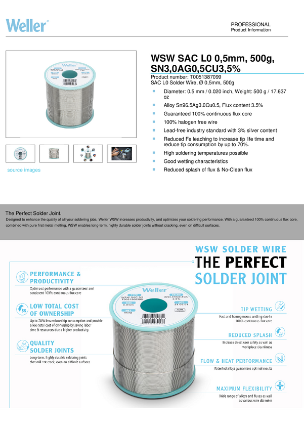 Cyna lutownicza bezołowiowa Weller WSW SAC L0 szpula Sn3,0Ag0,5Cu 500 g 0.5 mm