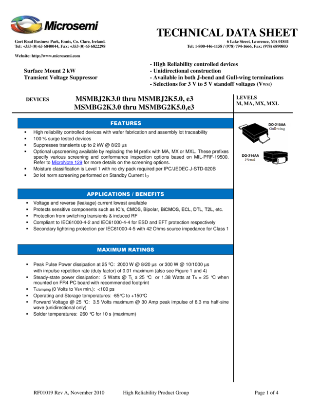 MSMCGLCE6.5A – MXLSMCGLCE170Ae3, MSMCJLCE6.5A – MXLSMCJLCE170Ae3