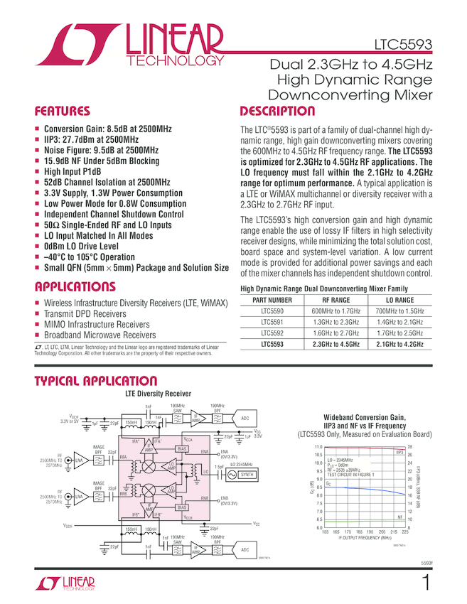 Dual 2.3GHz to 4.5GHz High Dynamic Range Downconverting Mixer