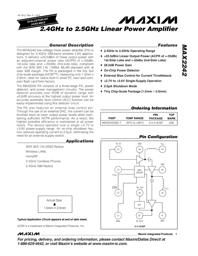 MAX2242 2.4GHz to 2.5GHz Linear Power Amplifier