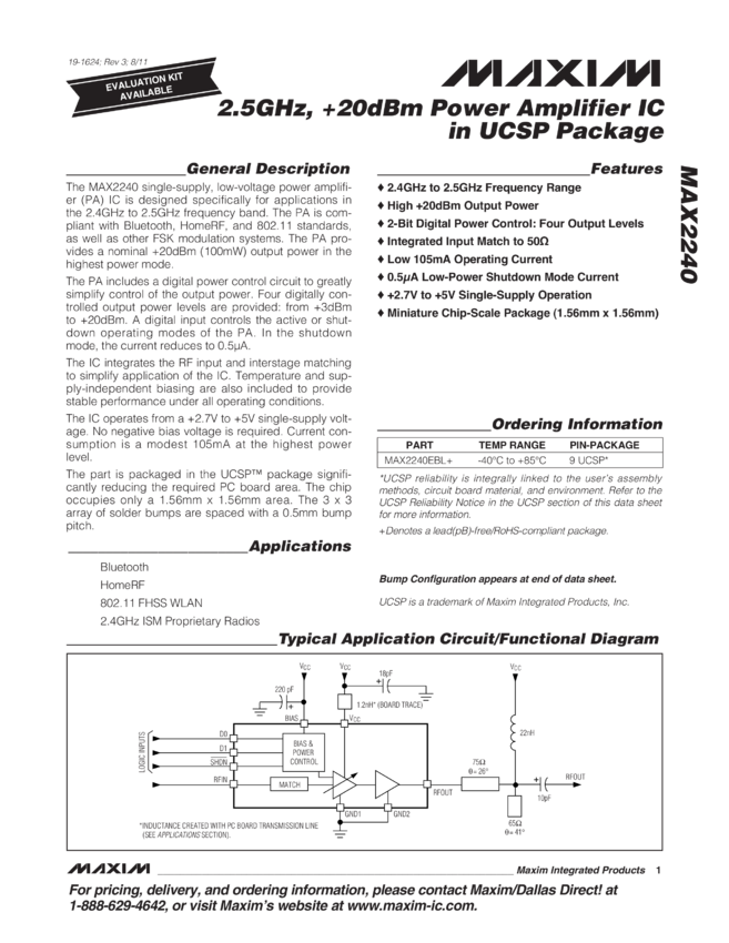 MAX2240 2.5GHz, +20dBm Power Amplifier IC in UCSP Package