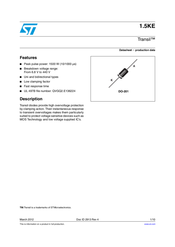 Dioda Transil dwukierunkowa 10,50V~11,60V/96,0A 1,5kW
