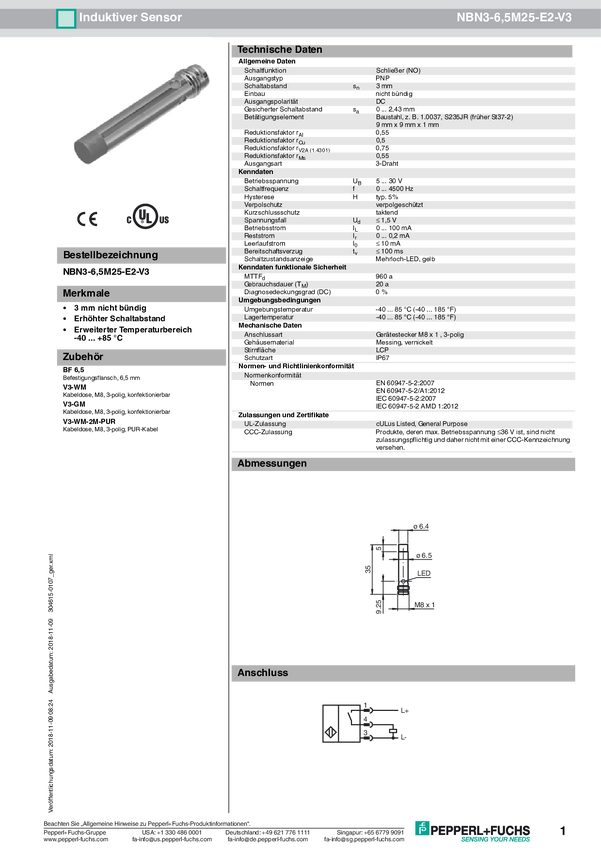 Pepperl+Fuchs Czujnik indukcyjny nie podtynkowy PNP NBN3-6,5M25-E2-V3