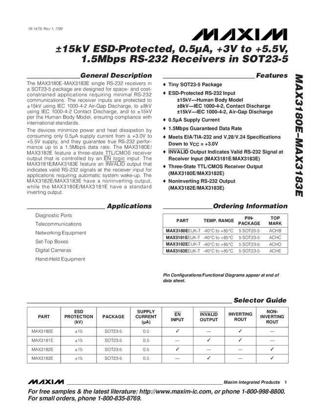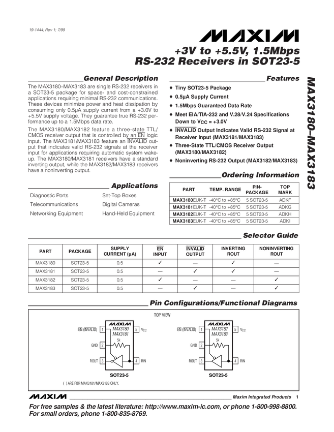 +3V to +5.5V, 1.5Mbps RS-232 Receivers in SOT23-5