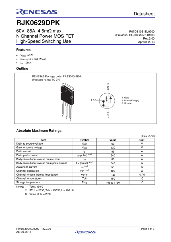 Nch Single Power Mosfet 60V 85A 4.5Mohm To-3P