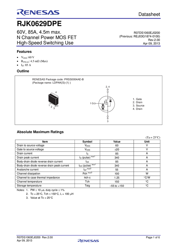 Nch Single Power Mosfet 60V 85A 4.5Mohm LDPAK(S)-(1)/To-263