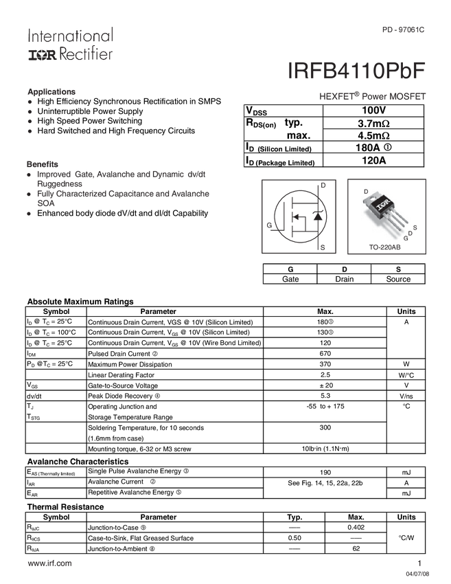 Tranzystor; IRFB4110; N-MOSFET; 130A; 100V; 370W; 4,5mOhm; unipolarny; TO220; THT; IRFB4110PBF; RoHS