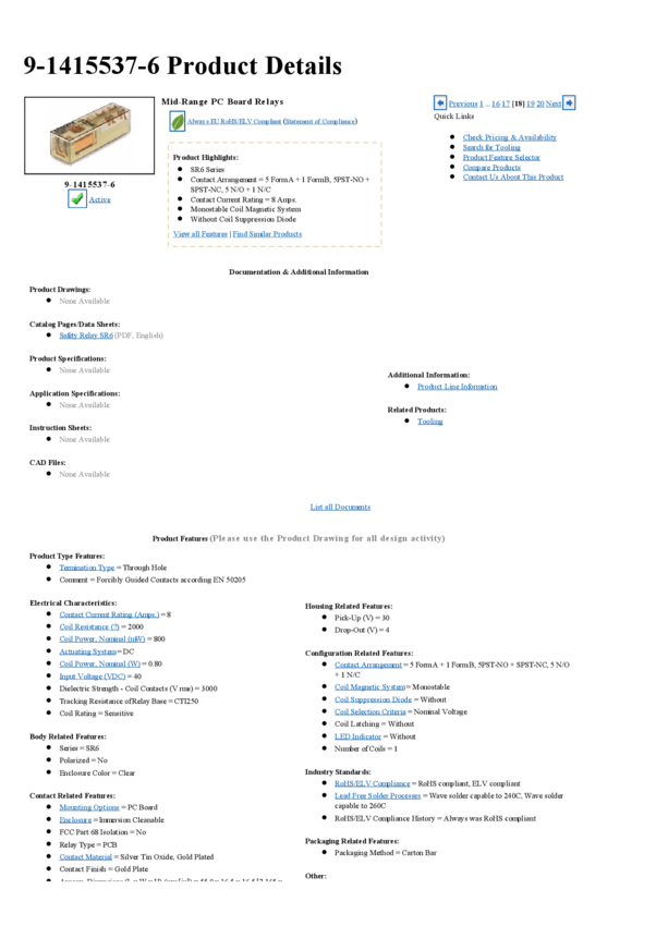 Electromechanical Relay 5PST-NO/SPST-NC 8A 18VDC 405Ohm Through Hole